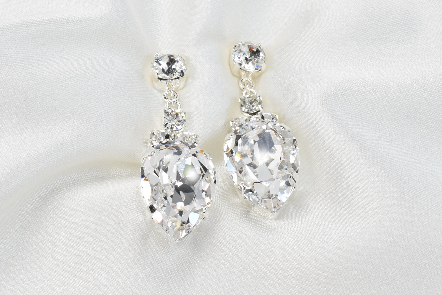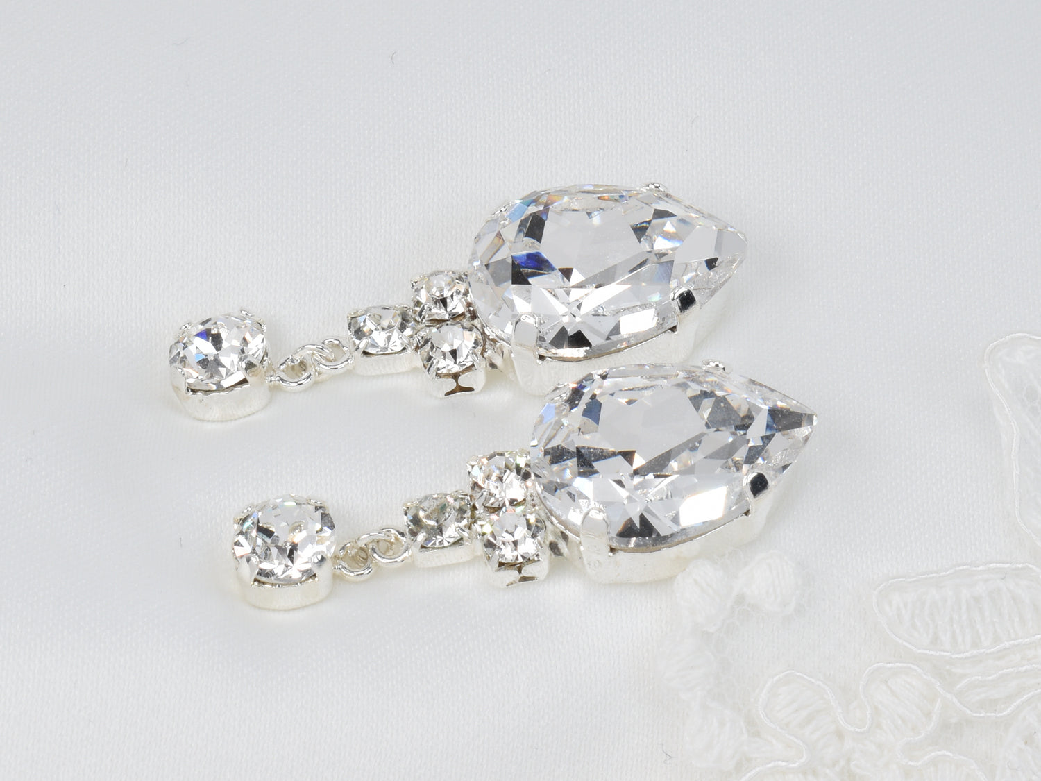 The focal point of the design is the pear shape Austrian crystal with its impressive sparkle from the facet cut crystal and upside down pear shape emphasised by brilliant cut Austrian crystals. The stud fitting adds even more shimmer and sparkle.