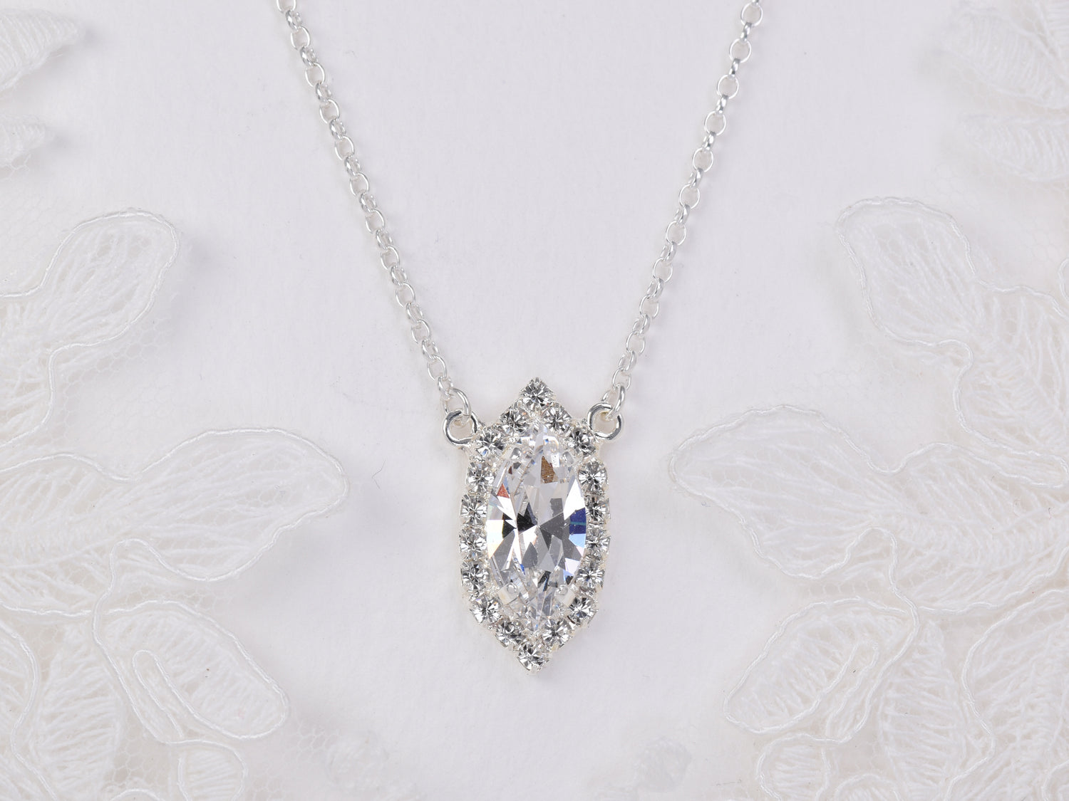 With a navette shape pendant Ruth is perfect with traditional, vintage or modern vintage styles of wedding dress and the geometric shape also has echoes of a simple Art Deco design.